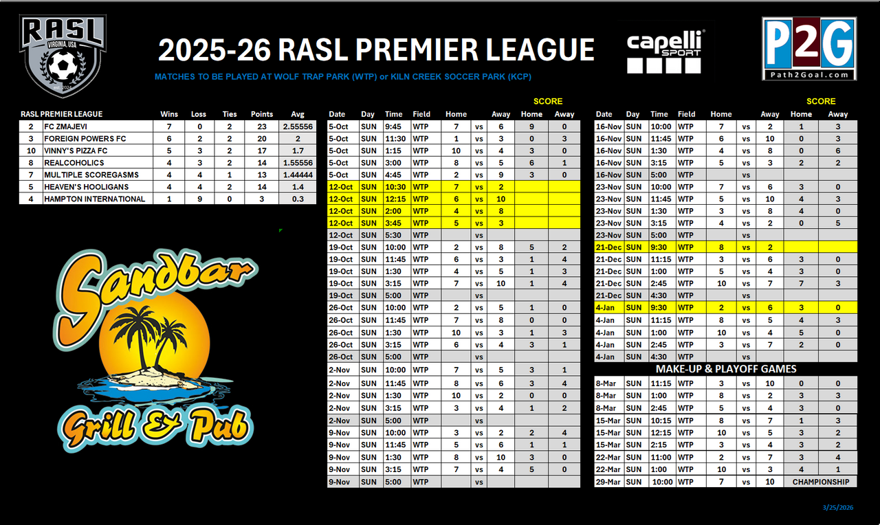 SCHEDULE & RESULTS2025-26 LEAGUE TABLE & RESULTSSPRING 2025 LEAGUE SEASONINAUGURAL 2024 SEASON RESULTS